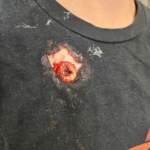 This hyper-realistic gunshot wound is part of a high-fidelity trauma scenario used to train students in critical bleeding control and trauma management. The detail—from the torn clothing to exposed tissue and blood spatter—is made possible by our in-house special effects specialist, who is professionally trained in medical moulage design.