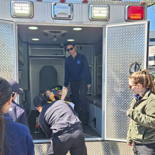 Students take a moment to smile and unwind inside our state-of-the-art classroom ambulance simulator. Surrounded by real EMS equipment, this immersive training space allows students to practice patient care, scene management, and team communication in a realistic prehospital setting.